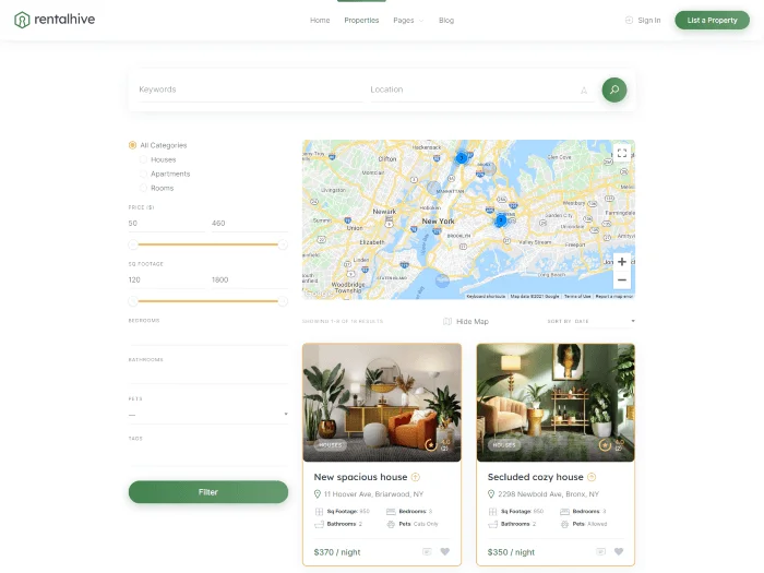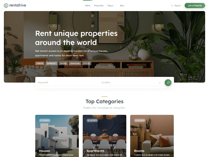 Create a fully-featured booking platform without any coding skills usіng RentalHive, a clean and modern WordPress theme for booking websites.